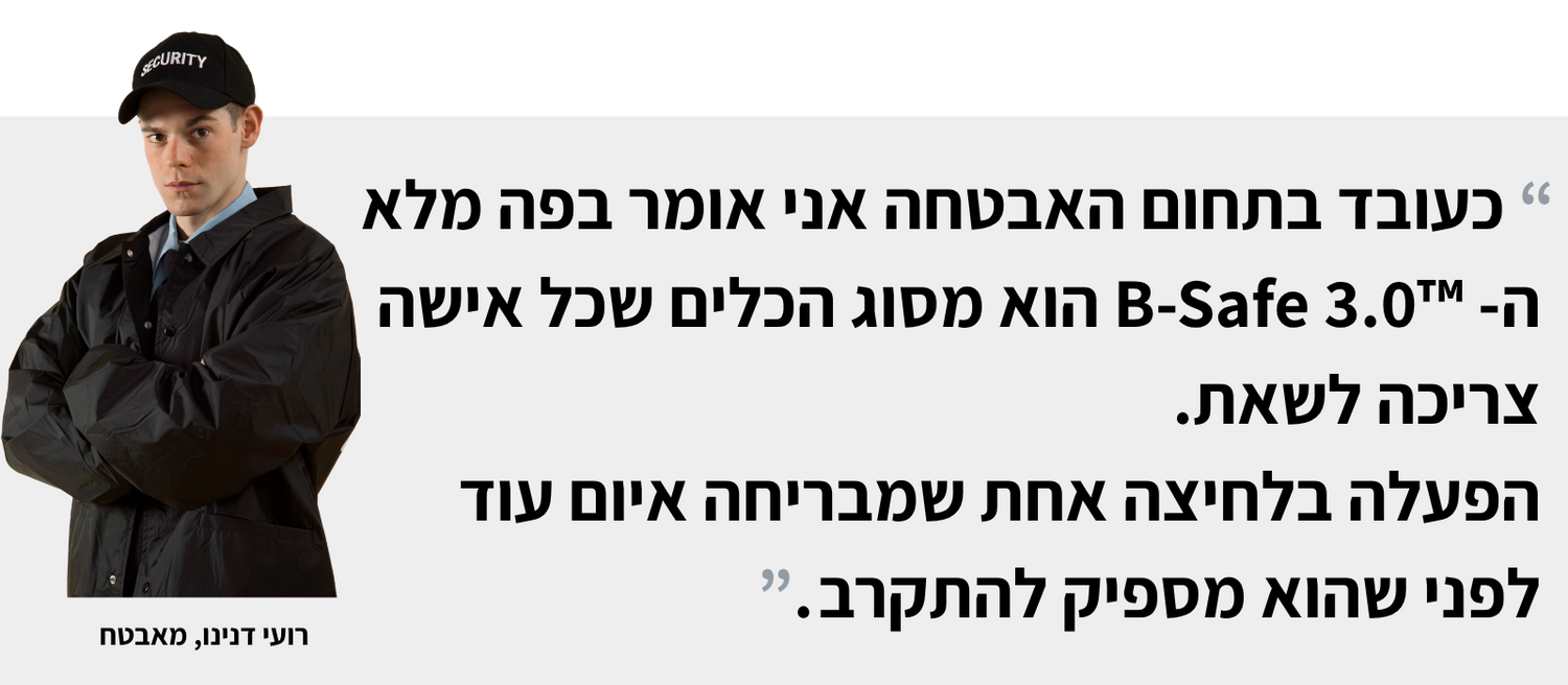 B-SAFE נותן את אותה מטרה לעצור את האירוע בלי להיכנס למגע, בלי כוח ובלי אימון.