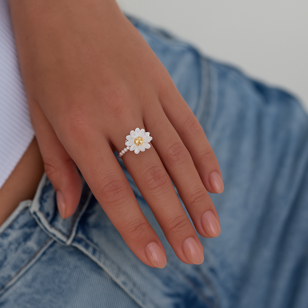 טבעת פתוחה שמחבקת את האצבע ברכות, עם עיצוב פרחוני שמזכיר קיץ רגוע ושמש חמימה. שילוב בין עידון לנוכחות, בין כסף מבריק לבין פרח עם נגיעה של צבע. טבעת Sia היא ההוכחה שכמה פרטים קטנים – יכולים לשנות את כל ההופעה.