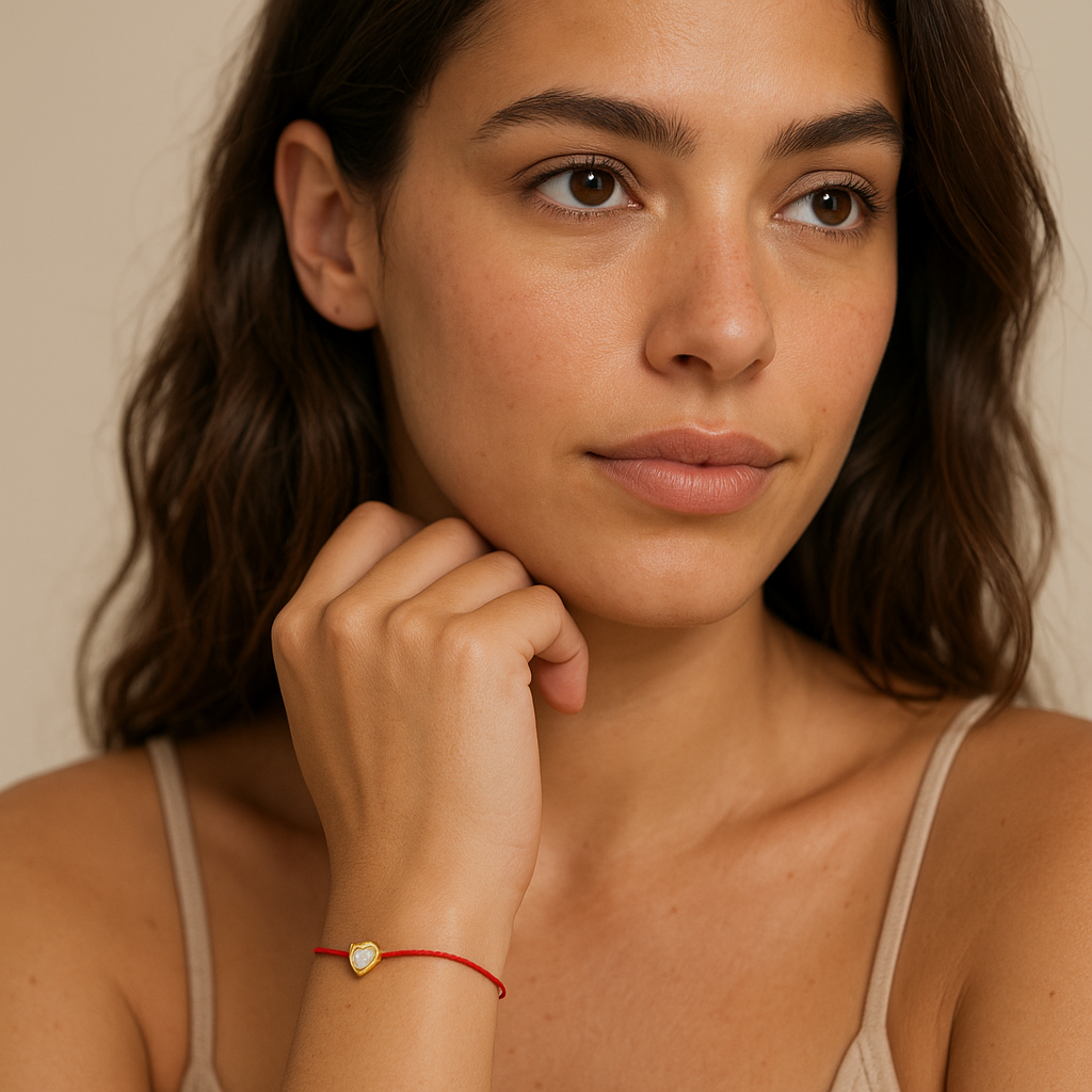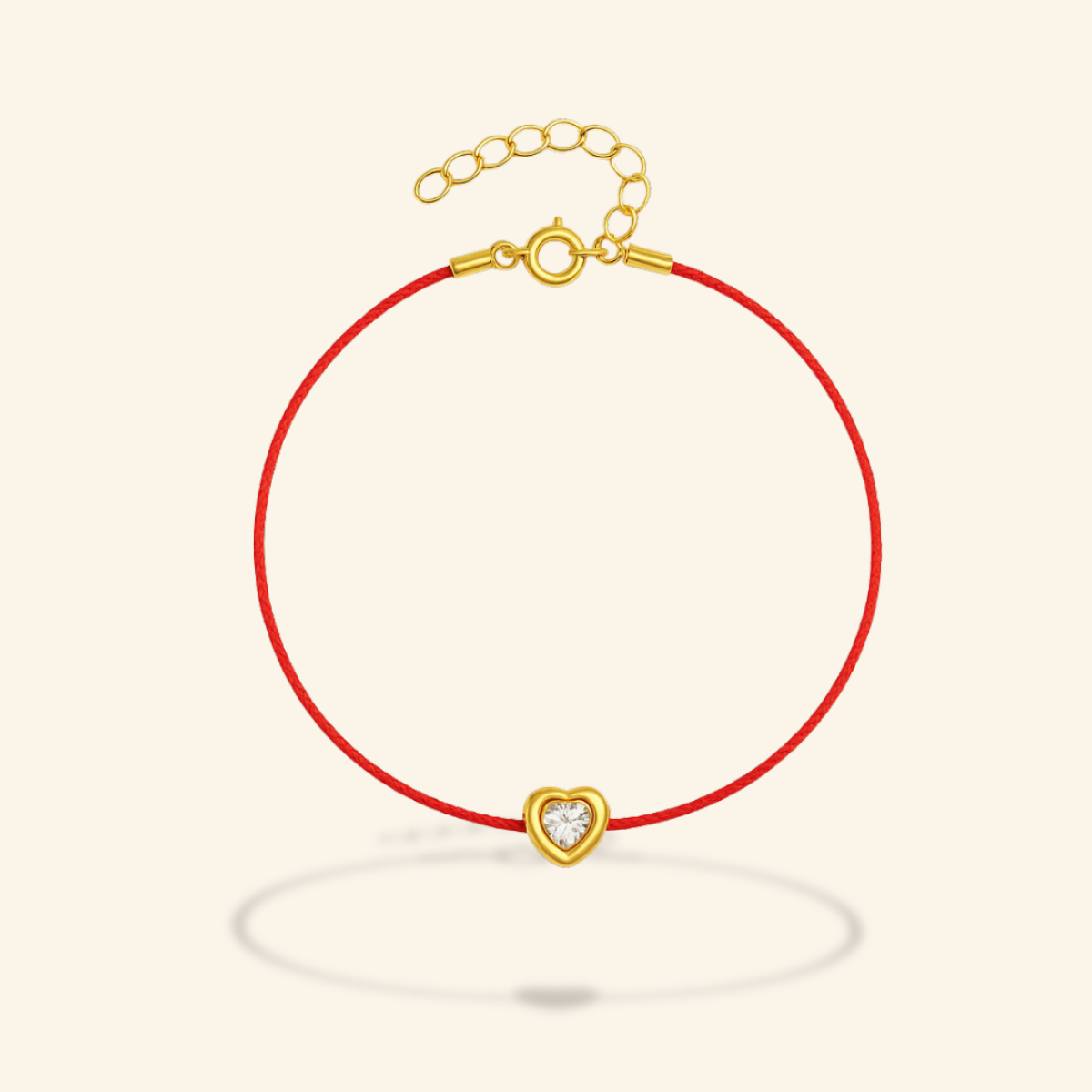 צמיד חוט אדום עם תליון לב מוזהב בשיבוץ זרקון לבן – עיצוב מינימליסטי שמשלב אלגנטיות, רוך ומשמעות. השרוך האדום מסמל אנרגיה חיובית והגנה, והלב מוסיף טאץ' רגשי אישי – מושלם כמתנה לעצמך או למישהי אהובה.